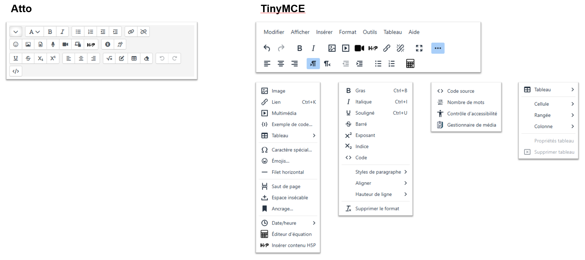 À la base, TinyMCE offre les mêmes fonctionnalités qu’Atto. Lorsque des fonctionnalités spécifiques étaient nécessaires ou nécessitaient des ajustements pour bien s’intégrer à Moodle, elles ont été implémentées dans TinyMCE par l’équipe de développement de Moodle. On peut penser à la fonctionnalité d’insertion d’activités interactives H5P, à l’éditeur d’équations, ou encore au module de gestion des médias.